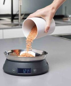 Waga Joseph Joseph składa się z dwóch części. Podstawa z wyświetlaczem LCD oraz miska, która stanowi pokrywę dla wagi jak również powierzchnie na której można ważyć produkty w torebkach czy innych opakowaniach. Po odwróceniu do miski można nasypać produkty sypkie.